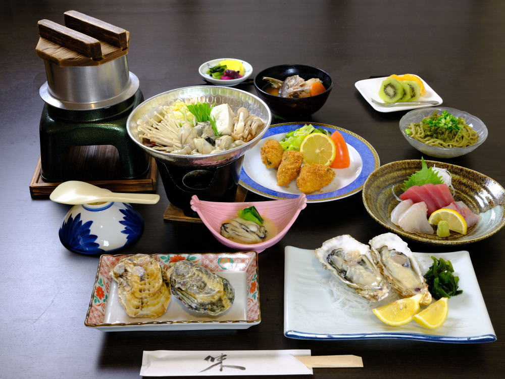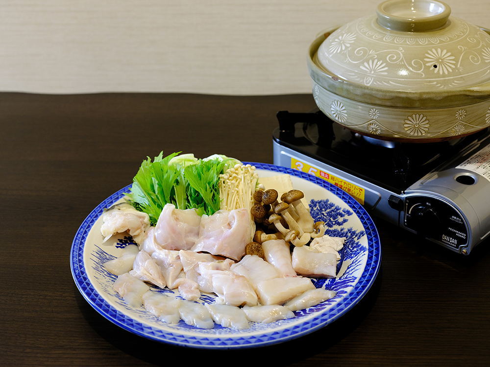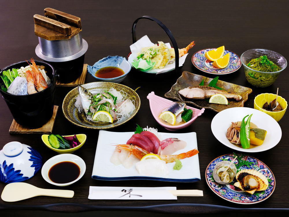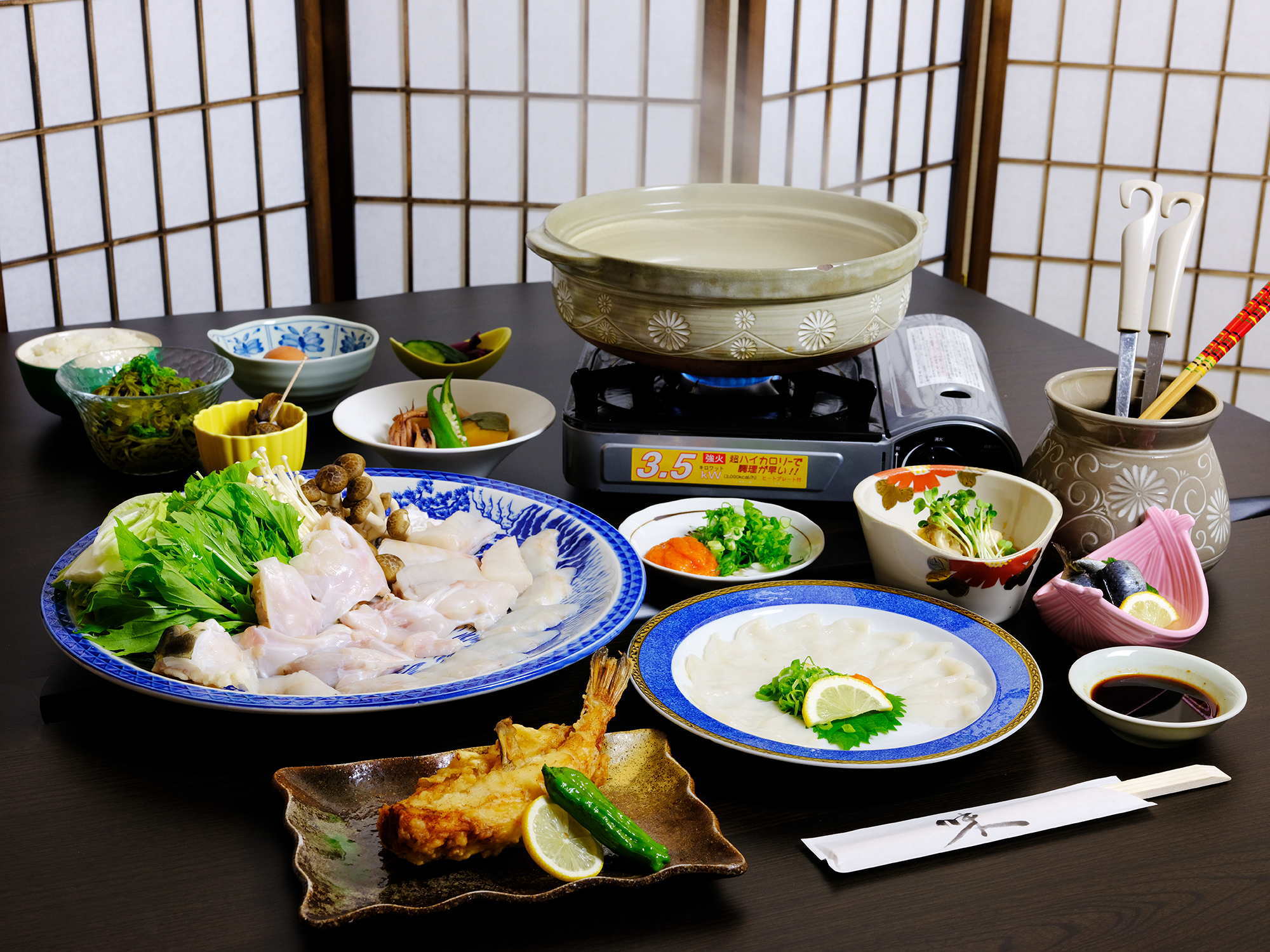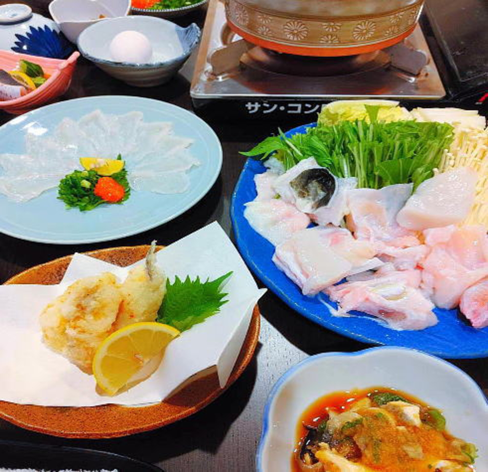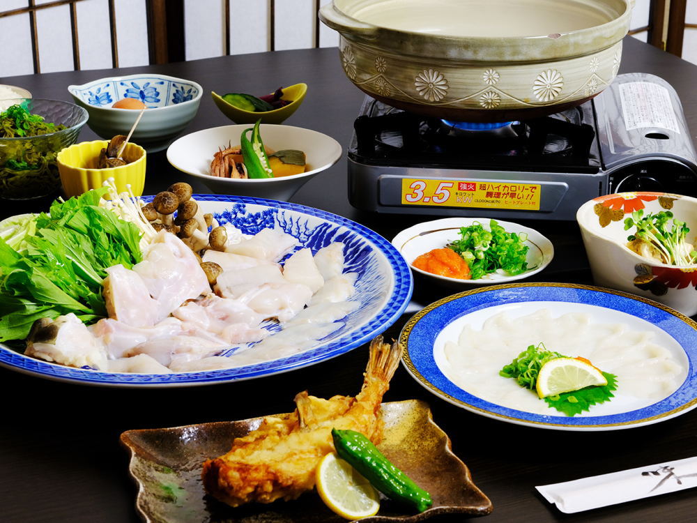 先付け・小鉢2品・ふぐ鍋・てっさ・皮湯引き・ふぐ唐揚げ・雑炊セット・フルーツ