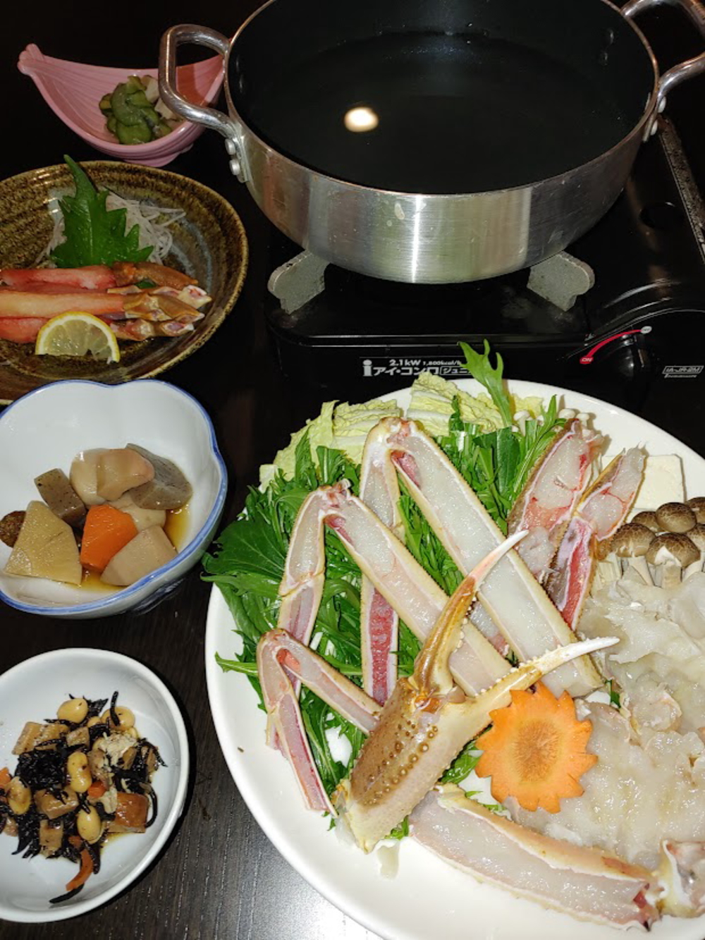 小鉢3品・かに鍋・かに刺し・雑炊セット・フルーツ